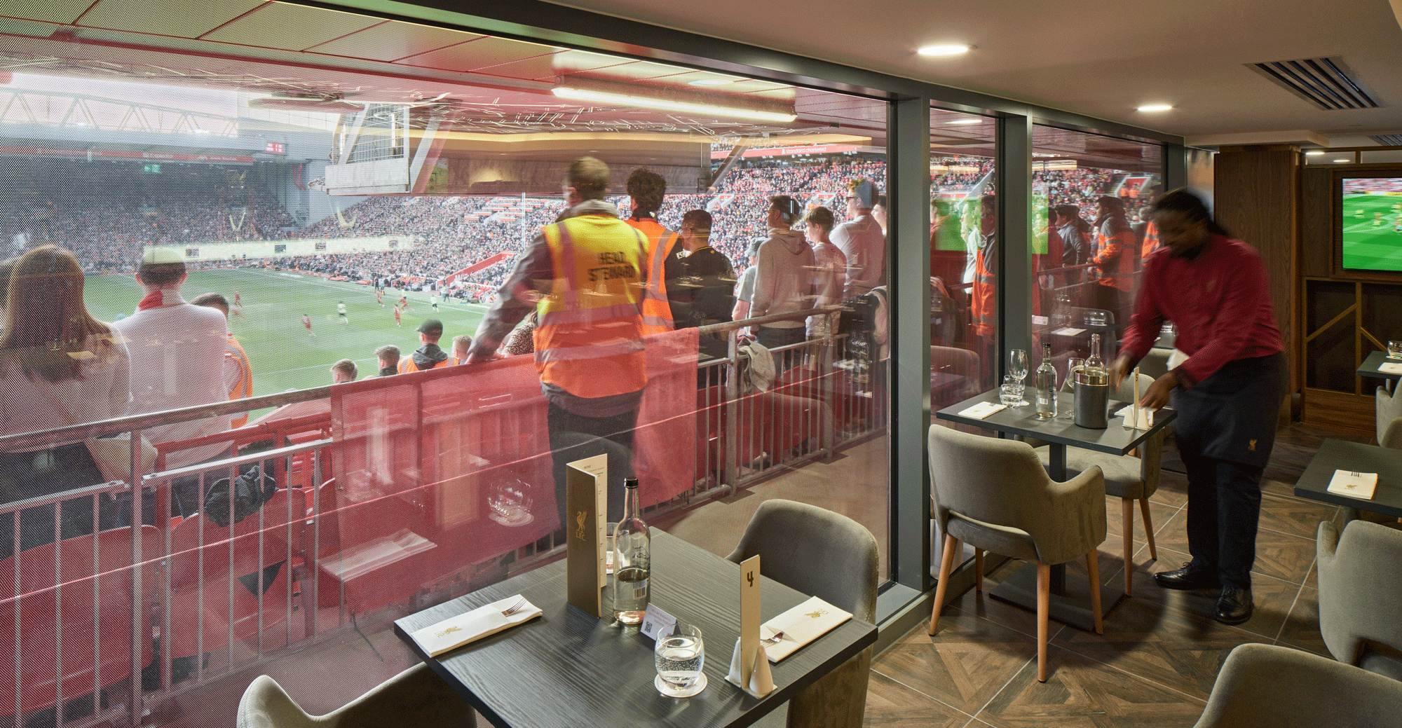 Brodies Lounge is a contemporary hospitality space designed to embody the excitement and distinctive ambience of matchdays at Anfield Stadium. It offers direct access and the best views of Stanley Park. The lounge is enhanced by large murals commemorating iconic goals scored at the end of Anfield Road throughout the years.