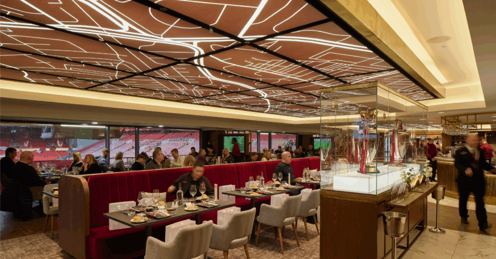 The Founder’s Lounge is an innovative hospitality lounge that delivers a unique, high-end experience. Accommodating 150 guests, it offers exceptional dining options in a luxurious setting. The objective was to establish an exclusive arrival experience that leaves a warm and opulent first impression. Its modern design incorporates glass facades that showcase stunning views of the pitch, while the lounge’s textures, colours, and intricate details pay homage to the city’s character and the club’s heritage.